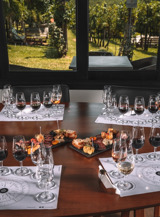 A experiência continua em nossa sala reservada premium com vista para os vinhedos, onde uma degustação orientada de oito rótulos exclusivos será realizada.