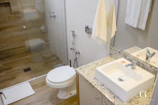 Chuveiro com aquecedor a gás, secador de cabelo, ferro elétrico, roupas de cama e banho, esquadrias externas em PVC.