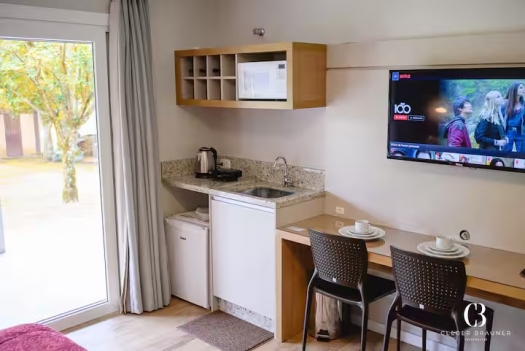 Equipada com cama Queen, sofá cama, Smart TV Full HD LED 43 Samsung + Wi-Fi HDR 2 HDMI 1 USB, ar condicionado, frigobar, micro-ondas, pia, sanduicheira, jarra elétrica, cafeteira elétrica, pratos, talheres, xícaras e copos, semelhante a um quarto de hotel (não permitimos uso de fogareiro ou churrasqueira trazidos pelos hóspedes).