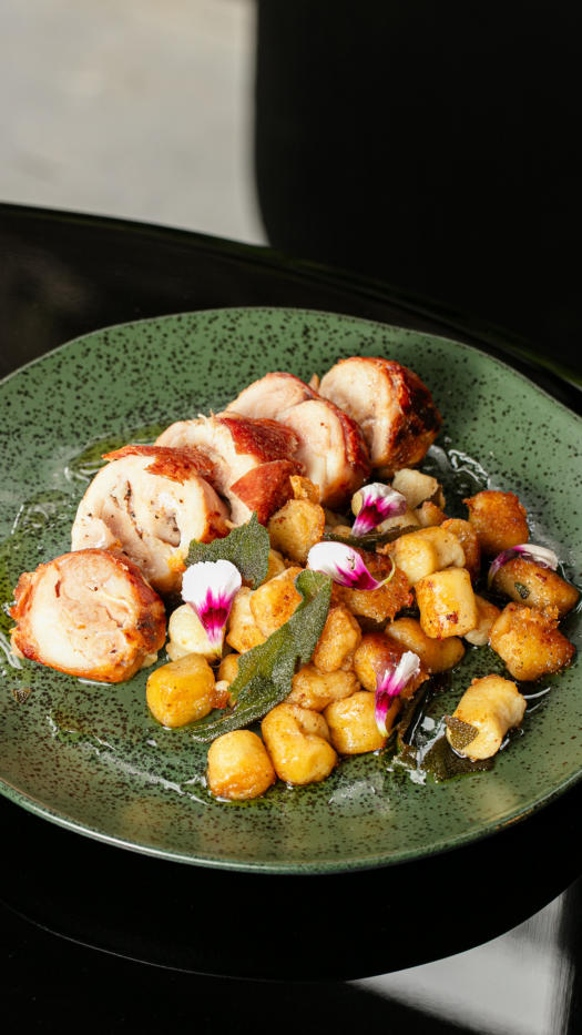 Prato Principal: Saltimbocca de frango acompanhado de nhoque artesanal tostado, envolvido em um clássico molho de manteiga e sálvia, conforto, aroma e tradição à mesa.