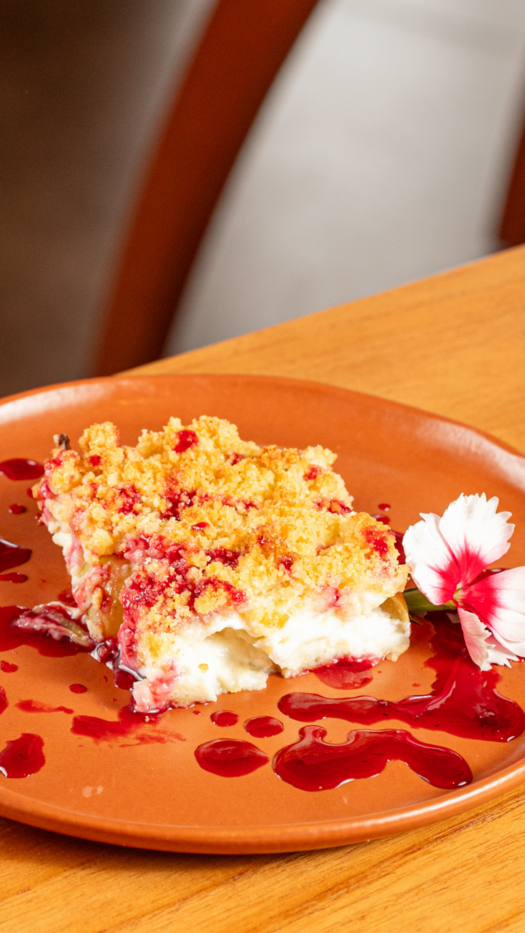 Sobremesa: Receita de vó, cuca cremosa de uva branca, encerrando o almoço com sabor de memória e afeto.