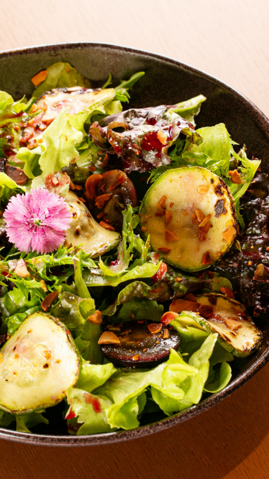 Entrada: Mix de folhas verdes com abobrinha italiana laminada, finalizado com uma elegante redução de uvas negras e amêndoas, trazendo leveza e frescor ao início da refeição.